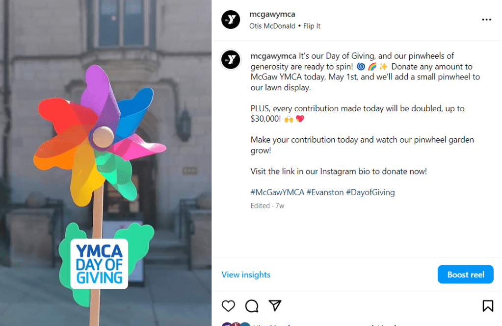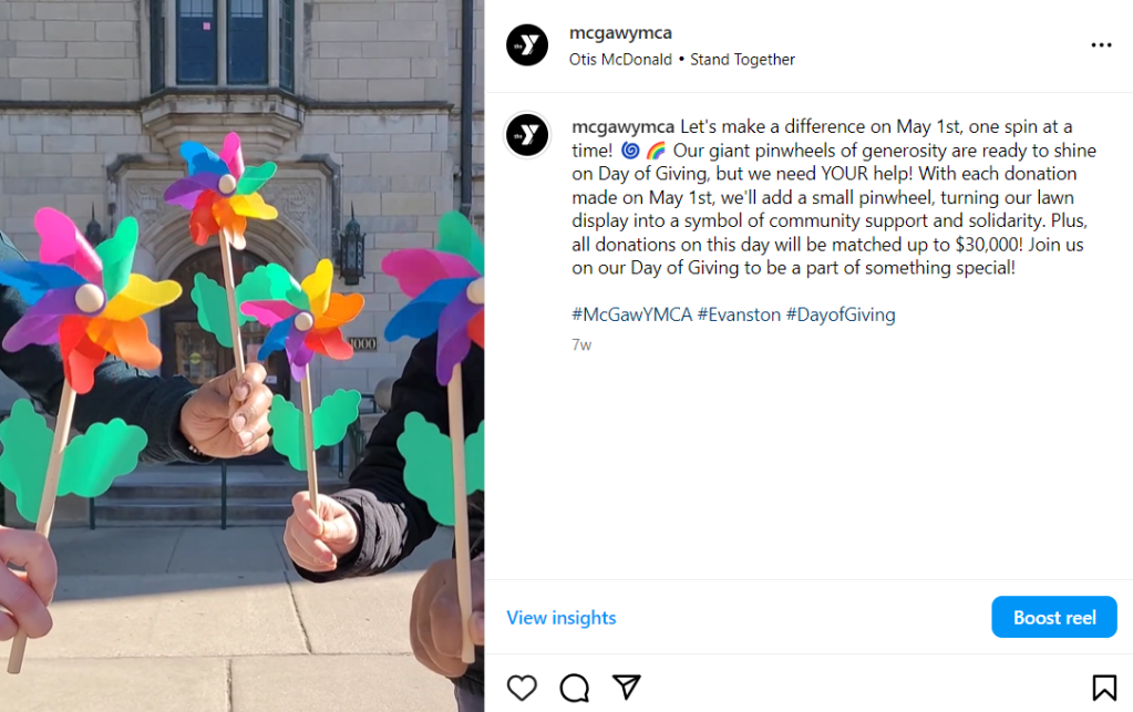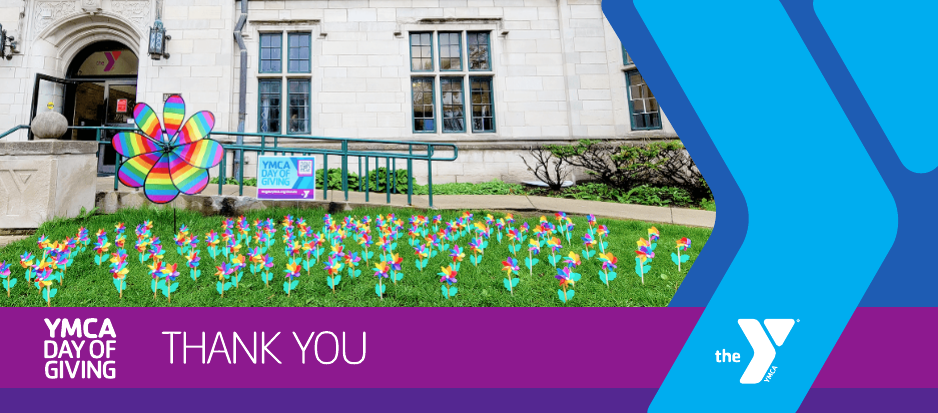 “The front lawn at 1000 Grove Street blossomed into a Garden of Gratitude, filled with pinwheels symbolizing the 117 donors who together gave over $12,000 for the Day of Giving. Thanks to a generous matching donation, every contribution to McGaw Y on May 1 was doubled, reaching a total of over $24,000.”