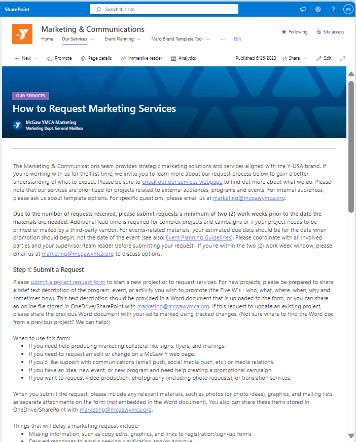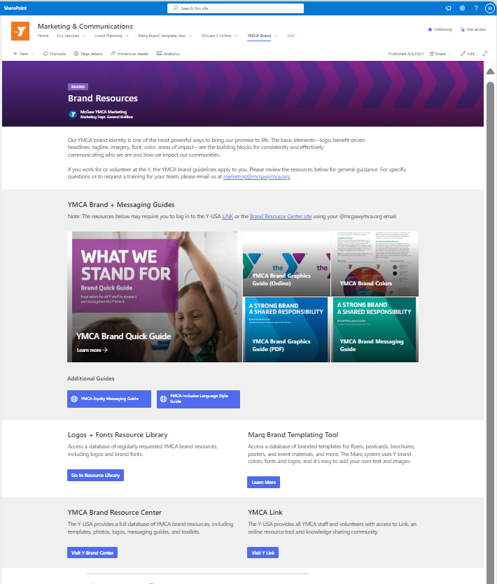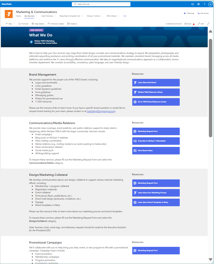 The Marketing & Communications team at McGaw YMCA provides organization-wide strategic marketing solutions and services aligned with the YMCA of the USA (Y-USA) brand. I designed this Marketing & Communications Department SharePoint site to provide staff colleagues with the necessary tools, artwork, and brand guidelines. The purpose was to increase transparency and equip everyone with brand templates, how-to guides, links to Y-USA resources, event planning resources, request forms, and links to the organization-wide Asana planning calendars managed by my team.