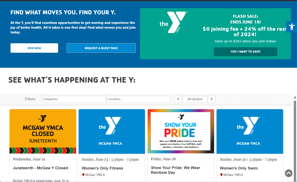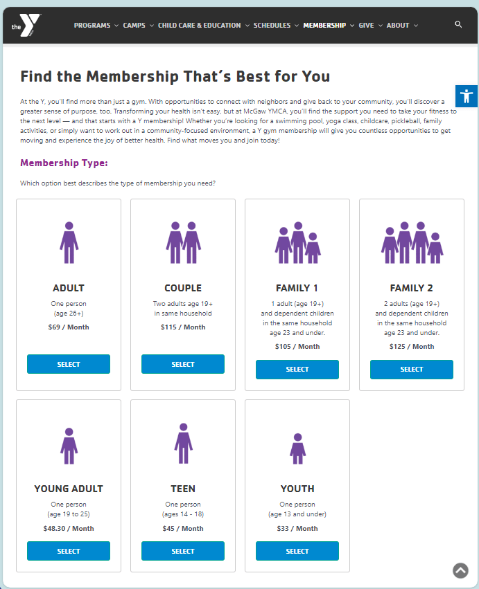 The previous website, created in 2010, provided a frustrating user experience due to its lack of responsive design, accessibility, and translation features. This YMCA needed a website that could meet the organization’s needs for post-pandemic growth, convert first-time users into buyers, and bring more brand awareness to the Y’s vital community-based work and offerings.